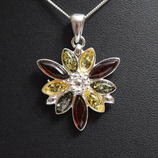 Baltic Blossom - Exquisite Floral Tricolor Amber 925 Sterling Silver Necklace (Pendant with Sterling Silver Chain)